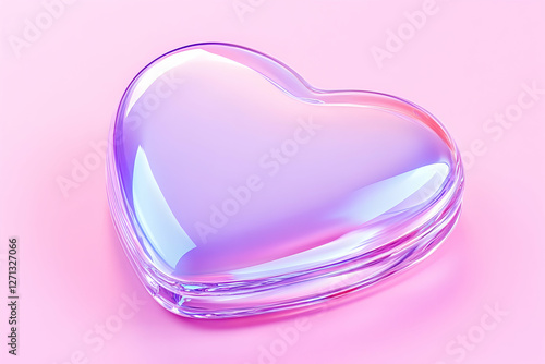Iridescent heart-shaped glass object on pink background; Valentine's Day card design