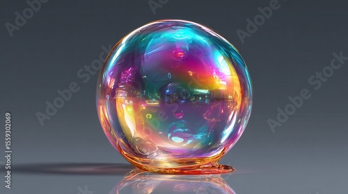 Iridescent spherical glass sculpture exhibits striking colorful light reflections and refractions