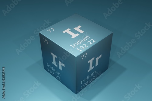 Iridium, 3D rendering of symbols of the elements of the periodic table, atomic number, atomic weight, name and symbol. Education, science and technology. 3D illustration