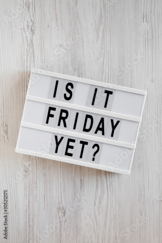 'Is it friday yet?' words on a lightbox on a white wooden surface, top view. Overhead, from above, flat lay.