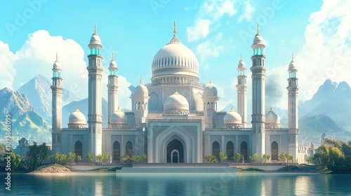 Islamic architectural marvel mosque with massive central dome, flanked by four tall minarets