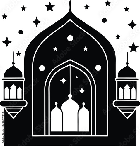 Islamic Architecture Gate Silhouette with Hanging Lanterns and Starry Night Sky