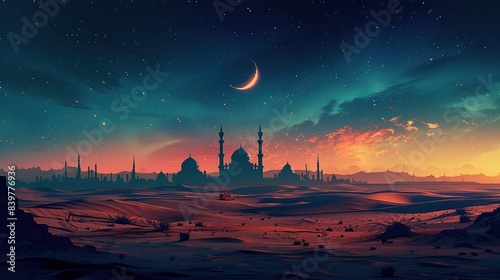 Islamic Design Wallpaper: Crescent Moon Over Desert and Mosque Silhouettes