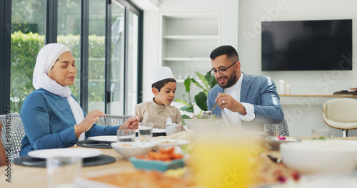 Islamic, family and dinner at dining table for ramadan, muslim celebration and eating food at home. Eid mubarak, culture and religious gathering with mother, father and son for bonding in apartment