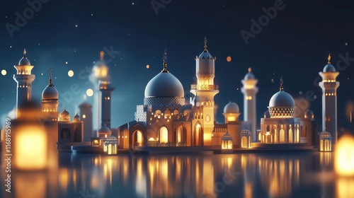 Islamic holiday banner in monotone design. Ramadan night. Cute mosque and lantern displayed on stages with glowing light in the evening. 3d illustration
