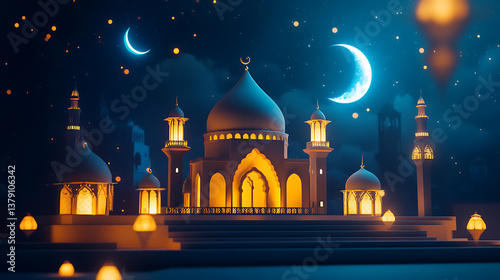Islamic holiday banner in monotone design, ramadan night, cute mosque and lantern displayed on stages with glowing light in the evening, 3d illustration, ai