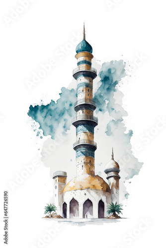 Islamic ottoman minaret watercolor illustration on white background, AI Generative illustration