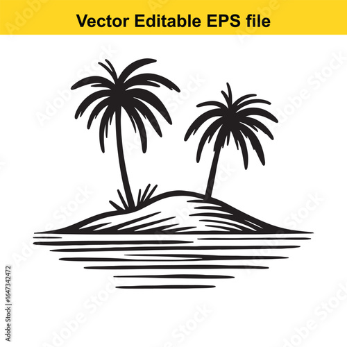Island, beach, palm silhouette of two palm trees on a small island in the ocean, isolated on white background