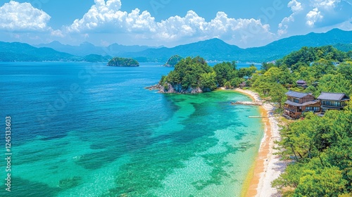 Island beach paradise, clear turquoise water, lush greenery, mountain backdrop, summer vacation