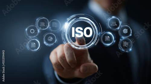 ISO certification and quality management concept with businessman touching global interface and document icons. Ideal for standard compliance, auditing, enterprise quality, and policy assurance