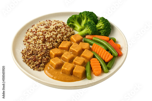 Isolate Transparent Vegetarian Food Around World Healthy Plate with Quinoa, Tofu, and Colorful Steamed Vegetables PNG Die-Cut For Advertising