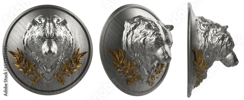 Isolated 3d render illustration of medieval round steel shield with bear head and golden leaves.