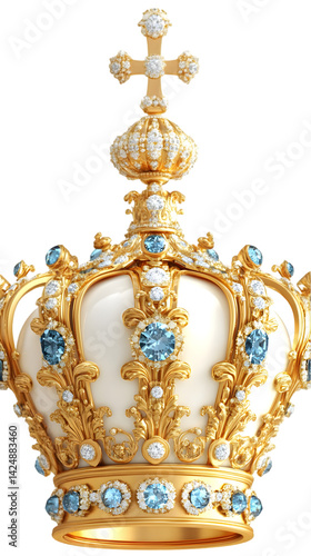 Isolated 3D Render Of An Elegant Golden Crown With Blue And White Gems