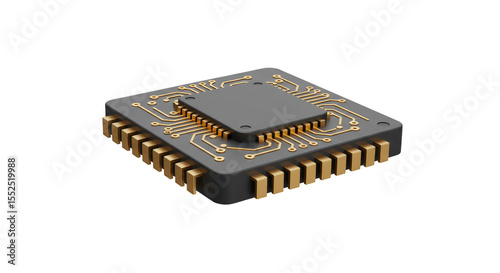 Isolated 3D Rendering of Microchip CPU Processor with Gold Pins on PNG