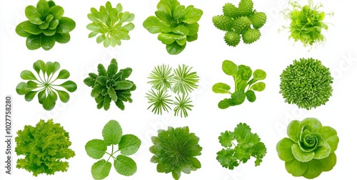 Isolated 3D top view green trees on white background, useful for architectural design and garden decoration
