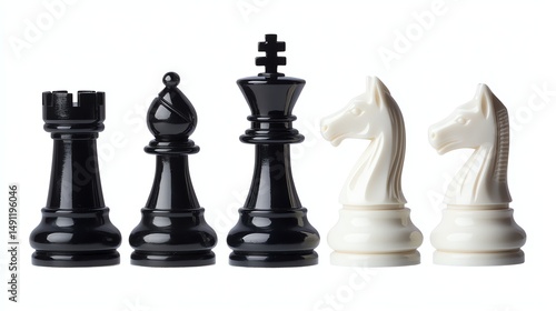 Isolated black and white chess pieces are prominently displayed against a stark white background.