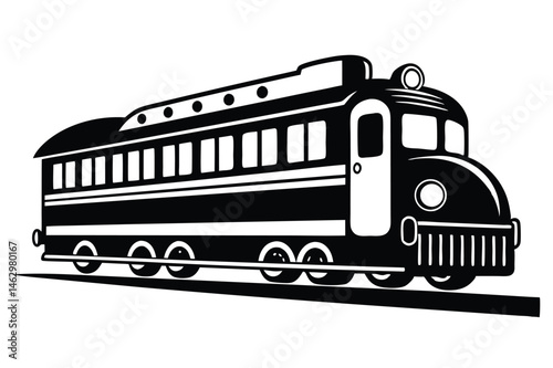 Isolated black and white shows a cartoon train moving along its railroad tracks
