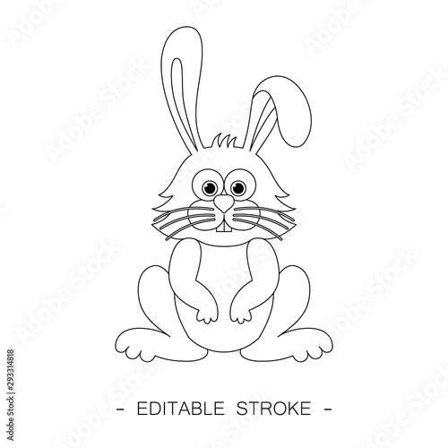 Isolated black outline cartoon sitting bunny, rabbit on white background. Curve lines. Page of coloring book. Editable stroke.