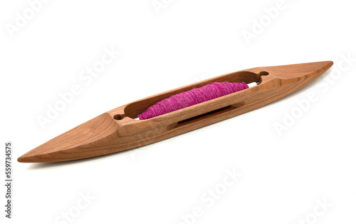 Isolated boat shuttle with pink or magenta yarn used in loom weaving. Wooden shuttle on white background