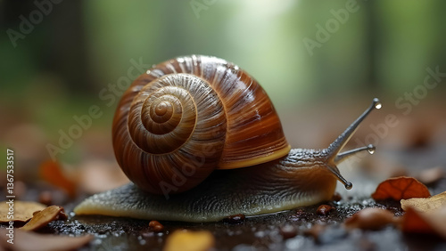 Isolated brown snail, a slow garden mollusk, shows its spiral shell