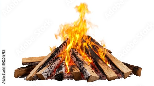 Isolated campfire with vibrant orange and yellow flames dancing atop a pile of firewood against a pristine white backdrop.