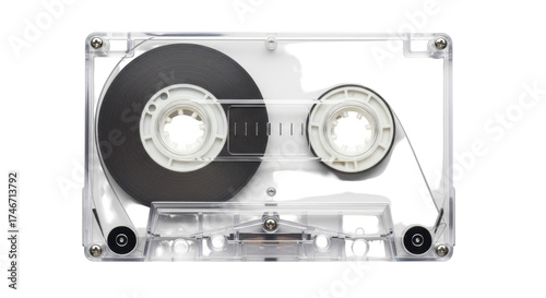 Isolated cassette tape with music on rewind, a vintage audio recording device for music albums