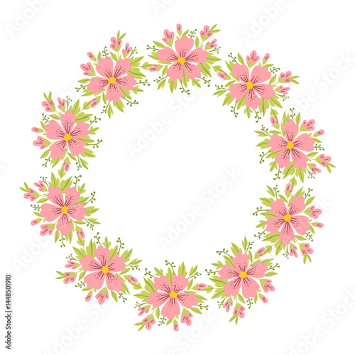 Isolated circular wreath of abstract pastel flowers on a white background.