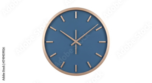 Isolated clock shows the time five o'clock, with a golden rim on a muted blue face