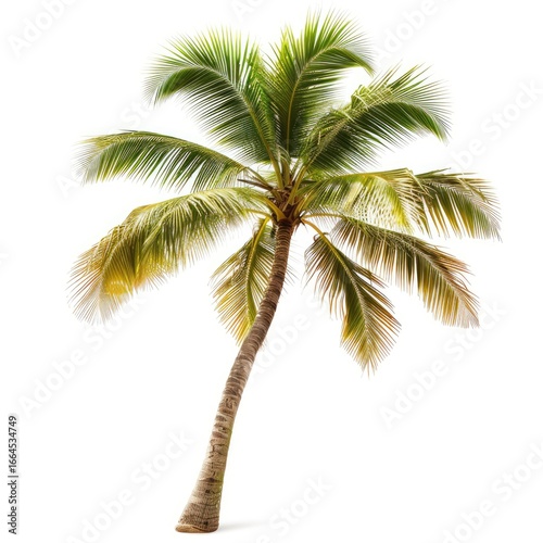 Isolated coconut palm tree against white background. Healthy, vibrant green fronds spread outward from a light brown, slender trunk. Tropical, lush, and serene
