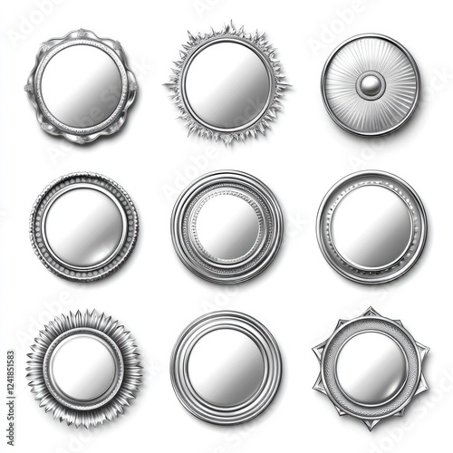 Isolated Collection of Shiny Silver Seals and Stamps for Certification and Approval Designs