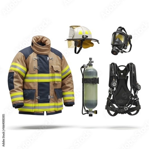 Isolated firefighter safety equipment showcasing a jacket, helmet, respirator , breathing apparatus, and air tank on white background