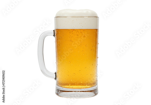 Isolated glass mug of foamy beer with condensation droplets on surface close up