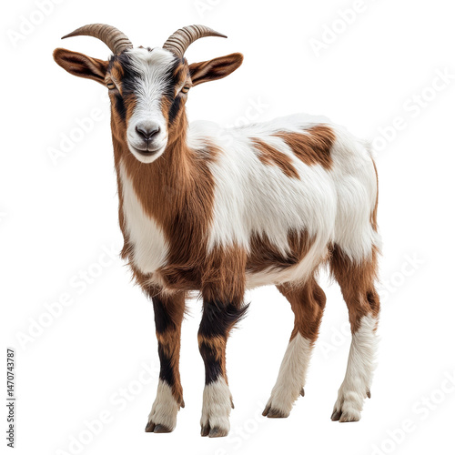 Isolated goat with striking brown and white coat showcasing distinctive horns and posture