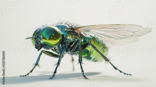 Isolated green metallic bottle fly in macro photography close-up on white background for scientific study