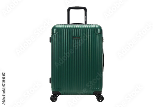 Isolated green ridged hard shell suitcase on wheels for travel and vacation luggage