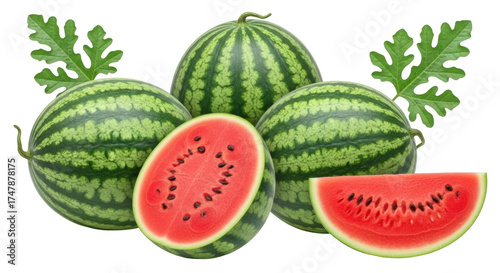 Isolated group of whole and cut watermelons with leaves; summertime healthy fruit harvest