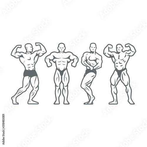 Isolated illustrations set of bodybuilders in heroic poses. Black and white illustration.