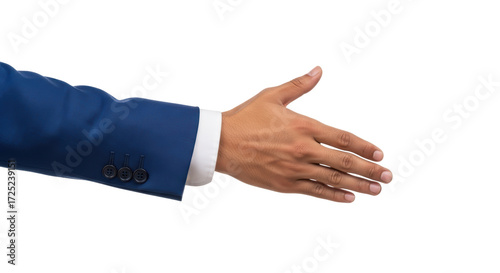 Isolated image of a male hand extended for handshake in a navy suit, offering greeting gesture