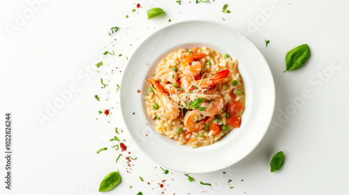 Isolated image of Risotto ai Frutti di Mare in a Parmesan Wheel on a white background, showcasing the seafood risotto and cheese wheel, with ample space for easy extraction.