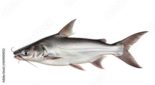 Isolated image showcasing a pangasius fish with silver body and prominent whiskers over black backdrop
