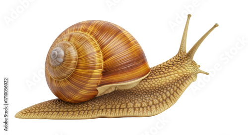 Isolated Land snail crawling along with a shell on its back in the garden in the spring