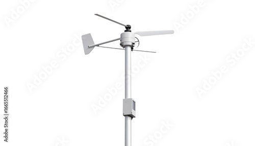 Isolated, light gray meteorological wind sensor mounted on a tall pole against a pure white background.