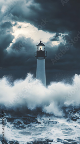 Isolated Lighthouse Battling Stormy Seas and Dark Clouds