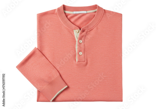 Isolated Long-Sleeve Henley Shirt, Folded, Salmon Color, Comfortable Cotton Fabric, Casual Clothing