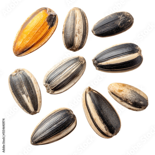 Isolated macro closeup of natural healthy sunflower seeds with shells on a white background, a perfect vegetarian snack ingredient