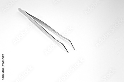 Isolated medical tweezers on white background for medical examination of sick patients surgery by doctor at hospital and clinic dental hygiene at dentist disposable accessory medical tool copyspace