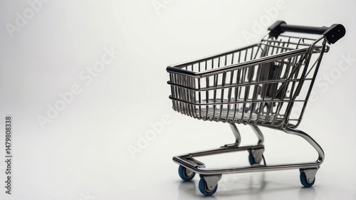 Isolated miniature shopping cart on white background offers retail consumerism concept