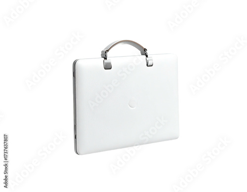 Isolated, minimalist, white briefcase with shiny handle and hardware against a black background
