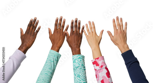 Isolated multiracial hands in the air for diversity and inclusion concept, wellbeing, and acceptance