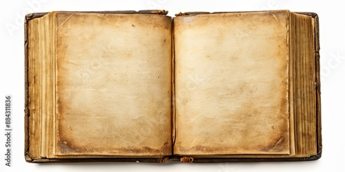 Isolated old book with blank pages on white background, antique, vintage, retro, aged, empty, parchment, paper, education